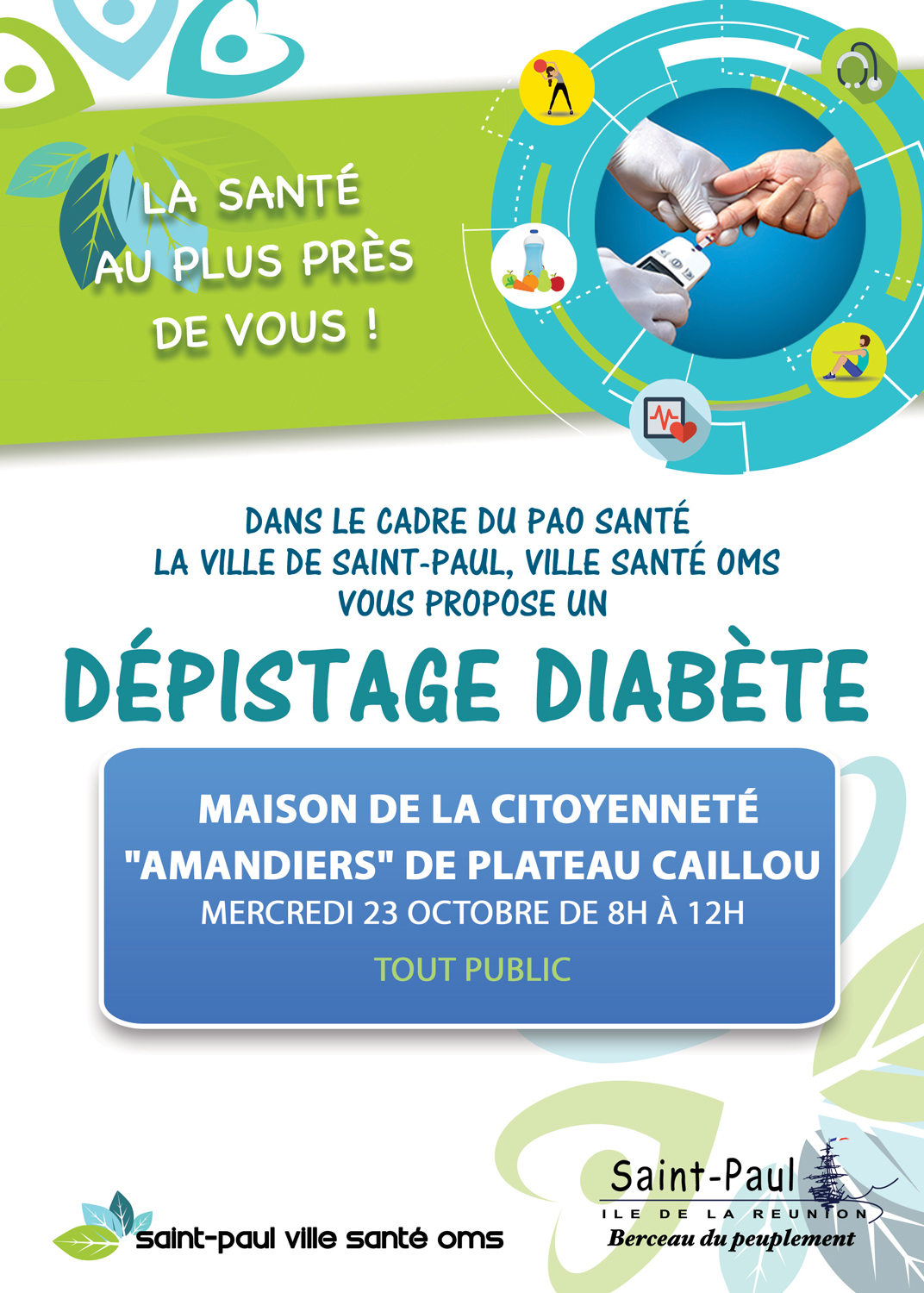 Dans le cadre du Plan d’Activités Occupationnelles (PAO) Santé, la ville de Saint-Paul, ville santé OMS, organise plusieurs dépistages du diabète. Cette opération santé est gratuite et ouverte à tout public, l’occasion de faire un petit point sur sa santé et s’assurer que tout va bien! Les dépistages auront lieu le :
