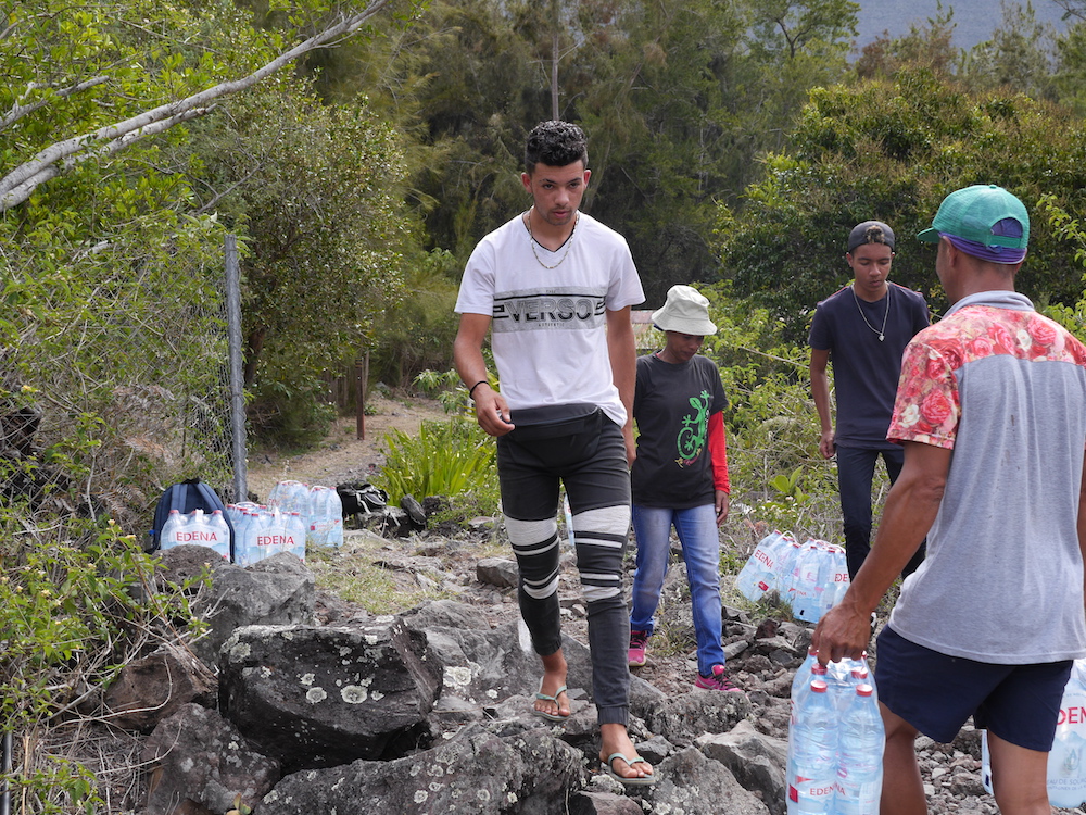 Coupés du monde géographiquement, les habitants de Mafate déplorent la tragédie qui se joue au Maïdo depuis vendredi soir. “Nous sommes coupés du monde avec l’incendie du Maïdo”, déplore Reine France BILIN, une habitante de Roche Plate. Cette mère de famille est venue récupérer les packs d’eau mis à disposition par la Créole et par la Ville de Saint-Paul. Pour gérer la distribution des bouteilles d’eau, l’association Ciel 974 s’est chargée de dispatcher en allant directement chez l’habitant, un pack d’eau dans chaque main. “Nous avons fait un recensement au porte-à-porte, afin d’identifier les besoins des familles”, précise Stéphane AH-FAT, président de l’association Ciel 974. Avec son binôme, il déposera 2/3 packs d’eau devant la case d’une gramoune. Mafate, c’est aussi cela. L’entraide et la solidarité entre voisins, proches et familles dans ce lieu dépaysant coupé du monde et à couper le souffle.